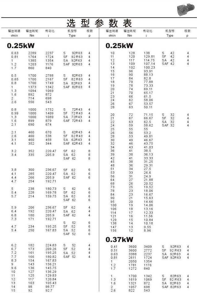 選型參數(shù)表0.25kW和0.37kW